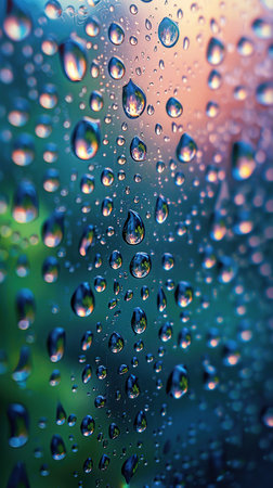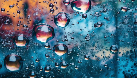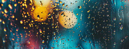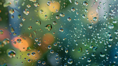 Close-up capture of rain drops on a glass window, showcasing a colorful background with a soft bokeh effect, enhancing the mood of tranquility and beauty.