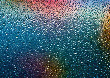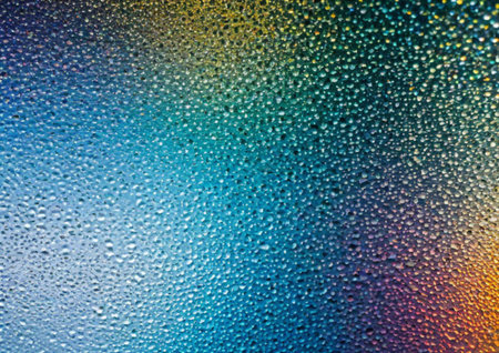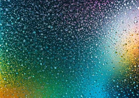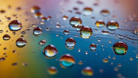 Close-up of water droplets on a colorful surface reflecting light and creating a vibrant pattern