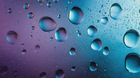 This image showcases a close-up view of numerous water droplets on a smooth surface. The droplets are illuminated with vibrant blue and purple colors, creating a visually appealing gradient. The composition suggests a cool, possibly indoor, environment with soft lighting. This image could be used for various commercial or artistic purposes.