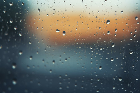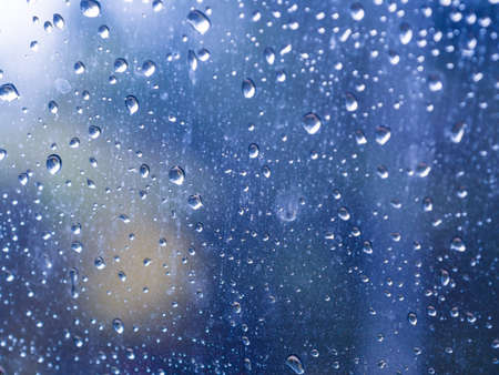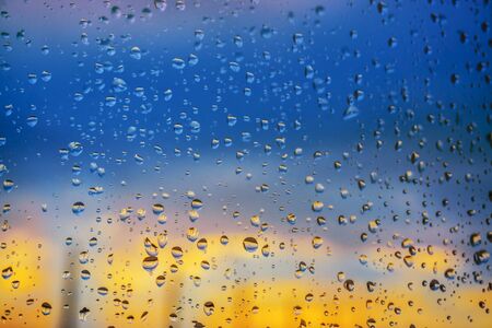 Water drops on window glass at sunset or sunrise. Natural background with copy space.