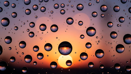 This detailed close-up image captures water droplets on a glass surface during sunset. The blurred background offers a serene ambiance with soft bokeh lights adding a touch of beauty.