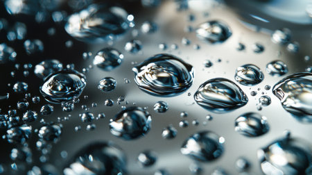 A detailed shot of water droplets on a metallic surface, with reflections and highlights creating a textured, visually interesting pattern.