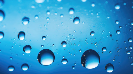 Water drops on blue background. Drops of water on surface. Macro photo. Splash pattern. Close-up.