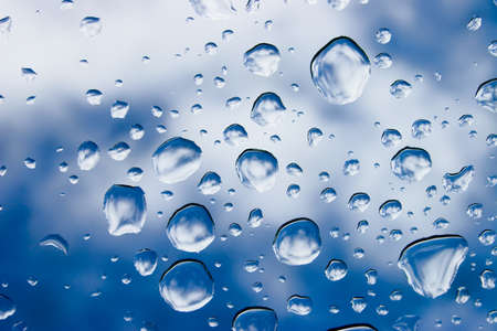 Water drops background. Water drops on glass window over blue sky.