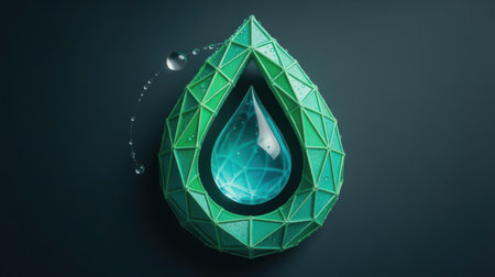 A faceted geometric green water drop encases a vibrant blue droplet, with small water splashes arcing around it. Clear details and vibrant colors enhance visual appeal.