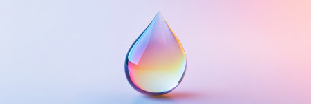 Hanging in the air, a single drop of water reflects vibrant rainbow colors against a smooth pastel background, capturing the essence of purity and natures beauty in a minimalist design