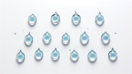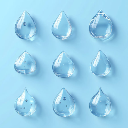 Various droplets in distinct shapes are positioned on a soft blue backdrop, highlighting their unique designs and transparency.