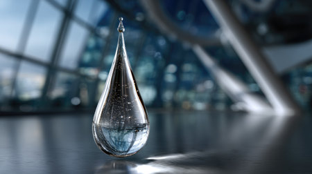 A close-up captures a water drop suspended against a blurred backdrop. The image displays a smooth texture, with cool tones dominating the scene. The composition evokes a sense of freshness and purity, suitable for various editorial and commercial applications. The background includes bright lights.