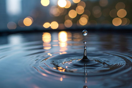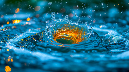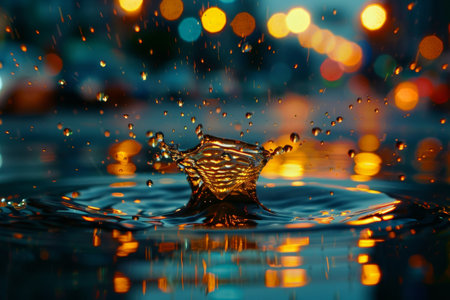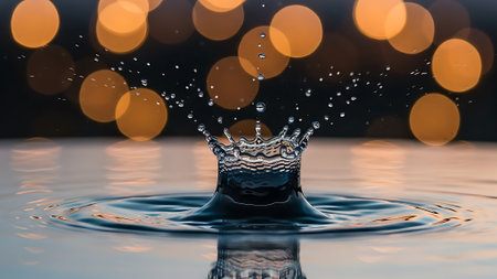 A close-up of a water splash with ripples and bokeh lights.