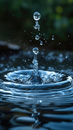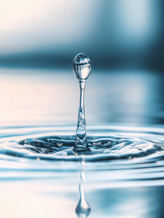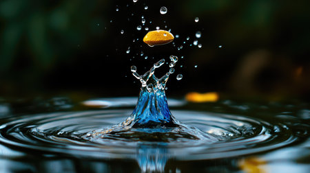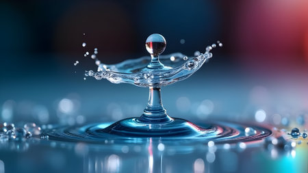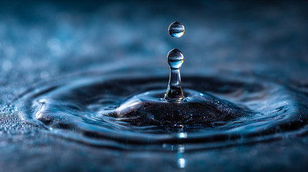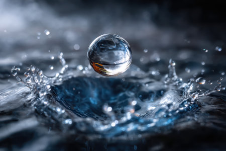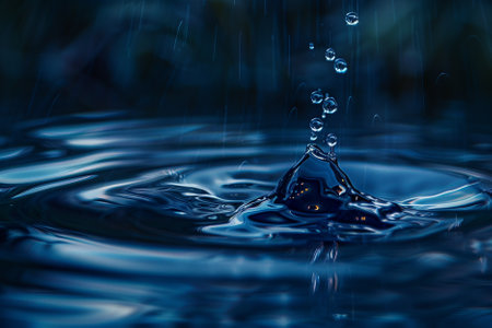A water droplet impacts a dark blue surface, creating ripples and reflecting light in a serene setting.