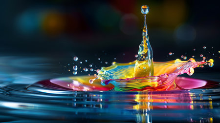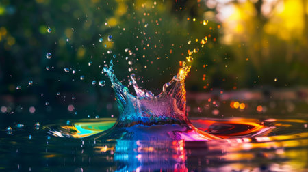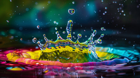 A mesmerizing water splash with vibrant colorful droplets creating an artistic and dynamic visual effect.