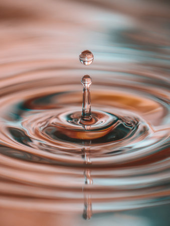 A single water droplet falls into a tranquil surface, sending out waves of ripples through a blend of orange and blue tones, creating a peaceful scene.