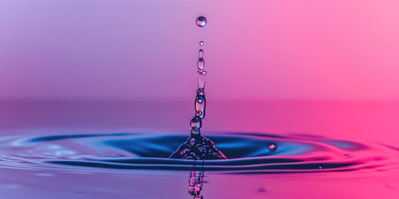 Macro shot of vibrant water droplets splashing, illuminated with neon pink and blue lights, creating a dynamic effect.
