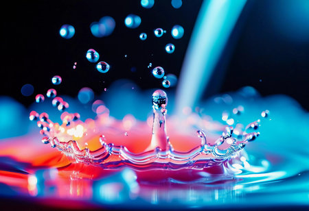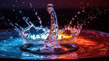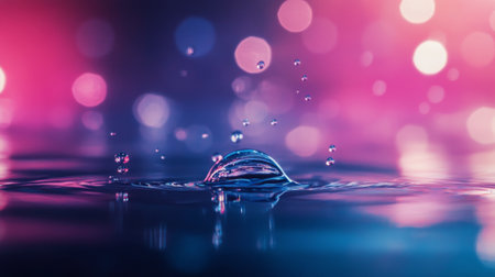 Stunning water splash captured against a vibrant bokeh background. The image highlights the dynamic interplay of droplets, creating a sense of motion and beauty.