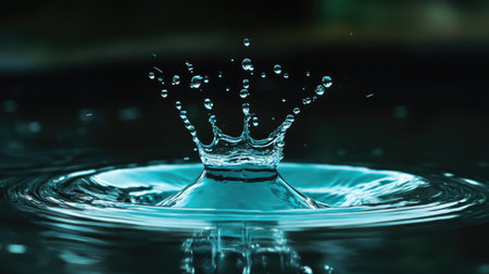 Water drop falling into water with splashes and ripples in background