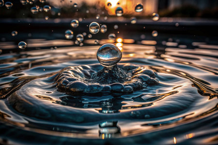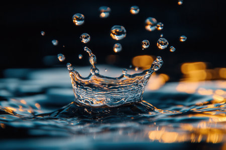 A dynamic image of water droplets splashing in the air with warm sunset light creating a beautiful bokeh effect, capturing motion and energy.