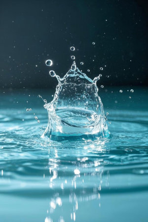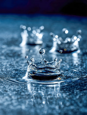 A close-up captures the moment a water droplet impacts a surface, generating a splash shaped like a crown. The image presents high-speed details of the liquid, in shades of blue. Its dynamic composition and clarity can be suitable for various advertising or illustrative uses.