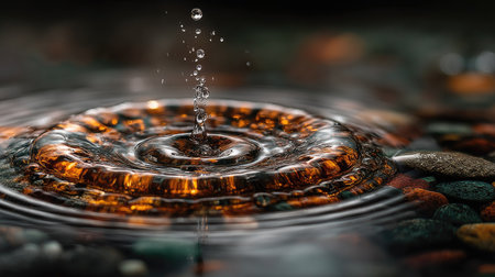 This mesmerizing image captures the moment of a water droplet splashing onto a serene surface, creating dynamic ripples and a stunning bokeh background that adds depth and beauty.