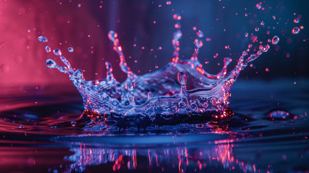 A close-up of a water droplet splashing with neon blue and pink lighting, creating a mesmerizing and abstract scene. Ideal for themes of energy, movement, and creativity.