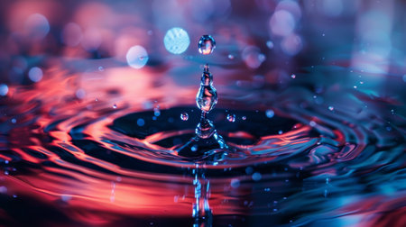 Close-up of a water droplet hitting the surface, creating ripples with colorful neon light reflections and bokeh effects.