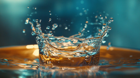 Dynamic close-up of a water splash, highlighting the motion and detail with golden and blue tones, creating an energetic visual effect.