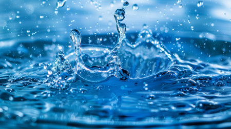 A detailed photograph showscasing dynamic water splashes frozen in motion, emphasizing clarity, fluidity, and vibrant blue tones.