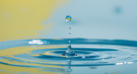 AI Generated. A water drop splashed in blue water in yellow colored background