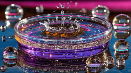 This stunning image captures a vibrant water splash in a circular dish, surrounded by glistening droplets and reflections, showcasing the beauty of liquid dynamics.