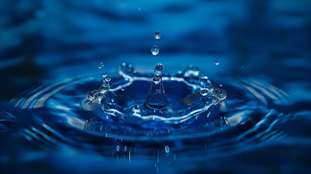 A macro photograph showcases a water droplet's impact, forming a crown-like splash. The image exhibits a vibrant blue hue and a smooth texture. The composition emphasizes concentric ripples. This image is suitable for various commercial uses, including advertising and educational materials, in a studio environment.