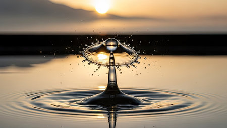 A water droplet creates a crown splash, captured in macro photography against a sunset backdrop. The image displays a symmetrical composition, reflecting the sunlight in the water. This photo could be used for various commercial projects related to nature, science, or artistic designs.