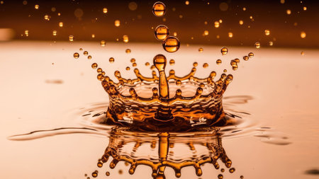 An artistic representation showcases the moment a water droplet forms a crown, captured with a high-speed technique. The image features a spectrum of amber and brown tones, with a focus on liquid textures and dynamic patterns. This composition could be used for various commercial projects related to beverages or abstract concepts.