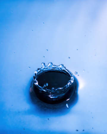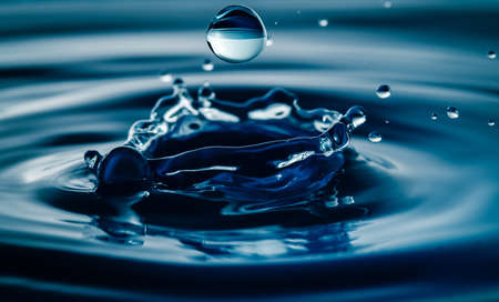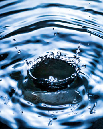 Dark blue water droplets splashed closely on the water surface. It creates a water wave and a perfect crown.