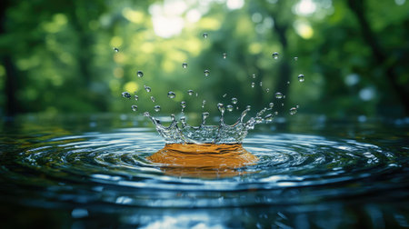Water is splashing in a pond creating a crown shape with ripples surrounding it and a green forest in the background