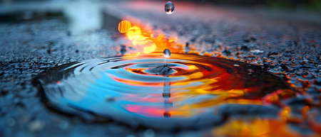 Water droplet creates ripples on a colorful surface in a tranquil setting