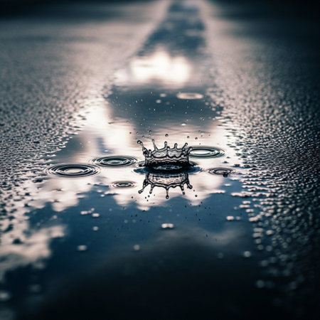 Single drop of water creating expanding circular ripples on a puddle surface, with a blurred background, offering a tranquil and meditative mood