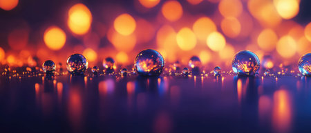 A single water droplet rests on a smooth surface, reflecting vibrant, colorful bokeh lights in the background during nighttime, creating a dreamy and artistic atmosphere.