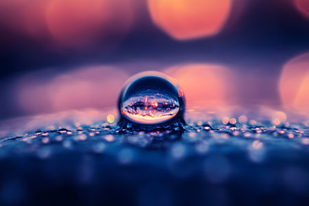 This stunning image captures a water droplet poised on the surface, reflecting vibrant city lights with a bokeh effect, creating a serene and artistic visual experience.