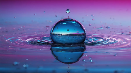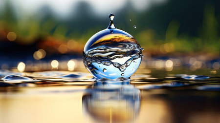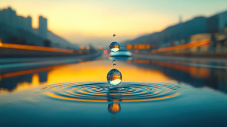 A water droplet impacts a dark blue surface, creating ripples and reflecting light in a serene setting.