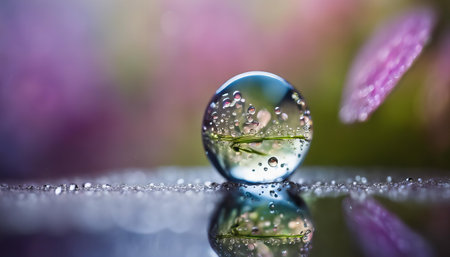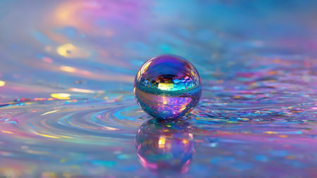 A perfectly spherical water droplet rises from a serene surface, creating concentric ripples while reflecting vivid colors from a soft-lit background, showcasing intricately details