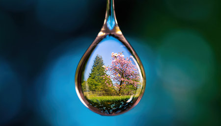 A delicate droplet mirrors blooming trees and lush greenery, showcasing the essence of spring.