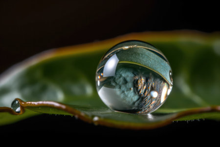 Transparent sphere reflects green plant in wet nature beauty generated by artificial intelligence