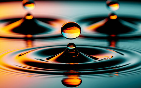 A single water droplet falls into a tranquil surface, sending out waves of ripples through a blend of orange and blue tones, creating a peaceful scene.