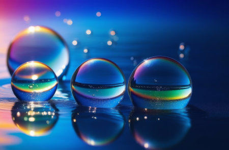 A mesmerizing sight of vibrant soap bubbles creating captivating light patterns on the tranquil surface of shimmering blue water, offering a serene and tranquil ambiance.