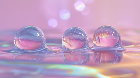 Three delicate bubbles rest on a pastel, iridescent surface, capturing soft light and colorful reflections, creating a dreamy, ethereal scene.