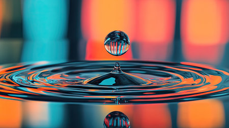A stunning close-up of a water drop creating ripples on a colorful background. The image captures motion and tranquility, showcasing beauty in simplicity.
