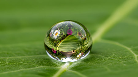 A pristine water droplet on a green leaf reflects a tiny world of white and purple flowers