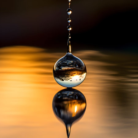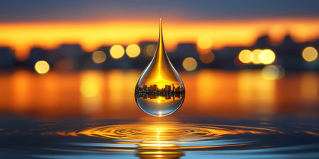 Golden Hour Reflection A Single Water Droplet Hangs, Mirroring City Lights at Sunset