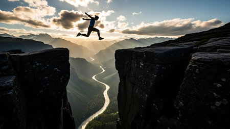 Dramatic moment of a person jumping across a gap between rocky cliffs at dawn, symbolizing risk, adventure, and freedom in nature landscapes
