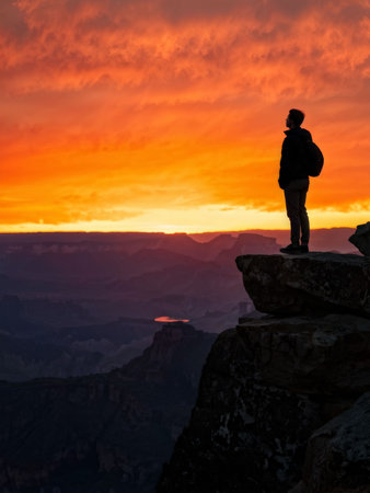 A man admiring the scenic views, sitting on the edge of a cliff, against the backdrop of a stunning landscape