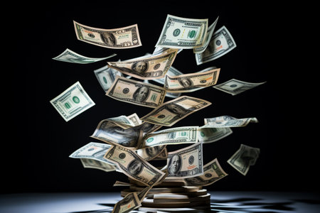 An artistic depiction of dollar bills and coins cascading down, creating a lively scene that symbolizes financial dynamics and economic transactions.